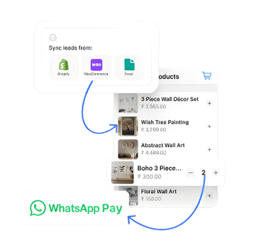 Sync your catalog via Shopify, WooCommerce, or Excel, letting customers browse and buy on the go via WhatsApp Pay